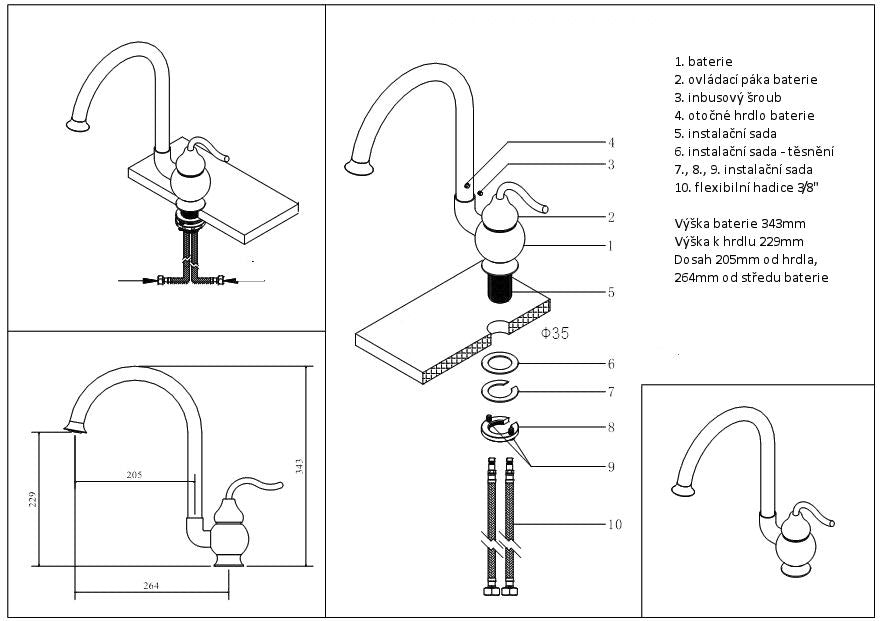 celková výška - 343mm, dosah hrdla - 264mm, Výška k hrdlu - 229mm