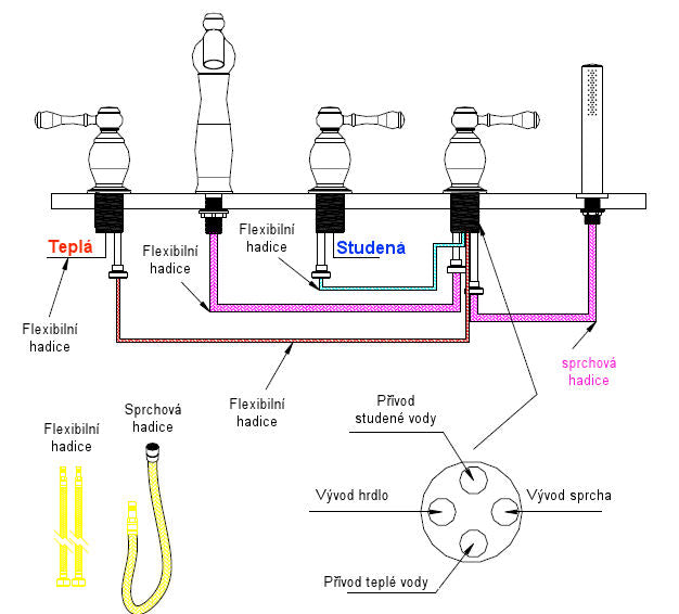 Baterie má dva masivní kohouty na studenou a teplou vodu, přepínač mezi sprchou a napouštěním vany (z hrdla) a ruční sprchu.